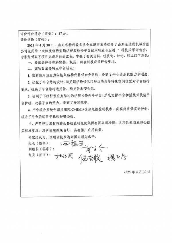金道成鍋爐爐膛檢修平臺新技術(shù)獲國內(nèi)權(quán)威認(rèn)證